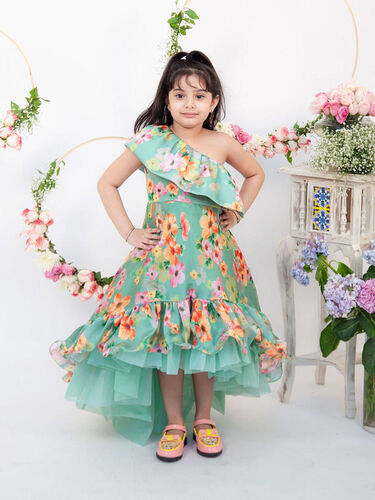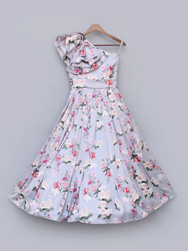 in Girls Pink & Grey Floral Printed Silk Frock