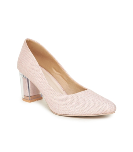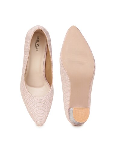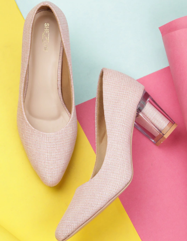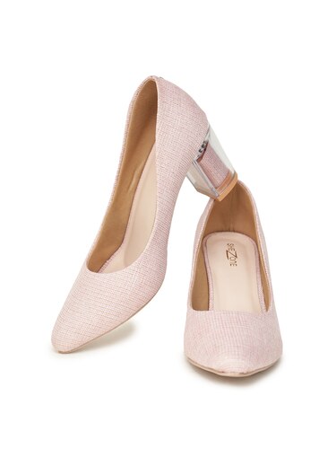 A pair of pink pointed toe pumps, has regular styling, closed back detail